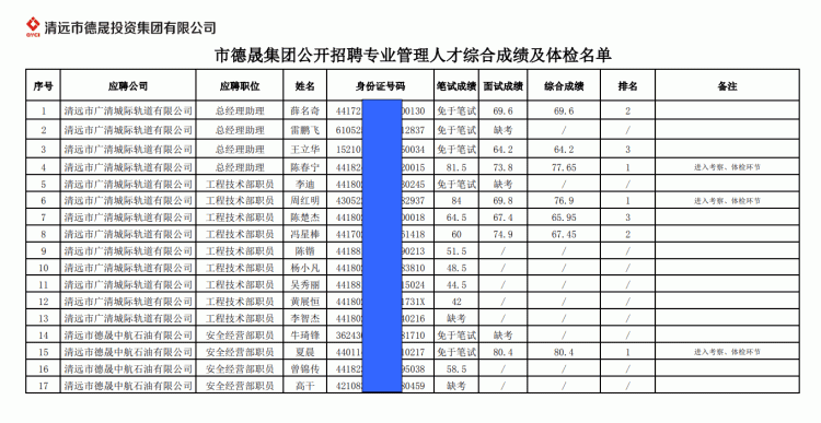 經(jīng)筆試、面試,現(xiàn)將德晟集團(tuán)公開(kāi)招聘專業(yè)管理人才綜合成績(jī)、進(jìn)入體檢、考察環(huán)節(jié)人員名單公布如下: