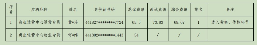 經(jīng)筆試、面試,現(xiàn)將市廣清城軌公司2024年公開招聘勞務(wù)派遣人員綜合成績、進(jìn)入體檢、考察環(huán)節(jié)人員名單公布如下:
